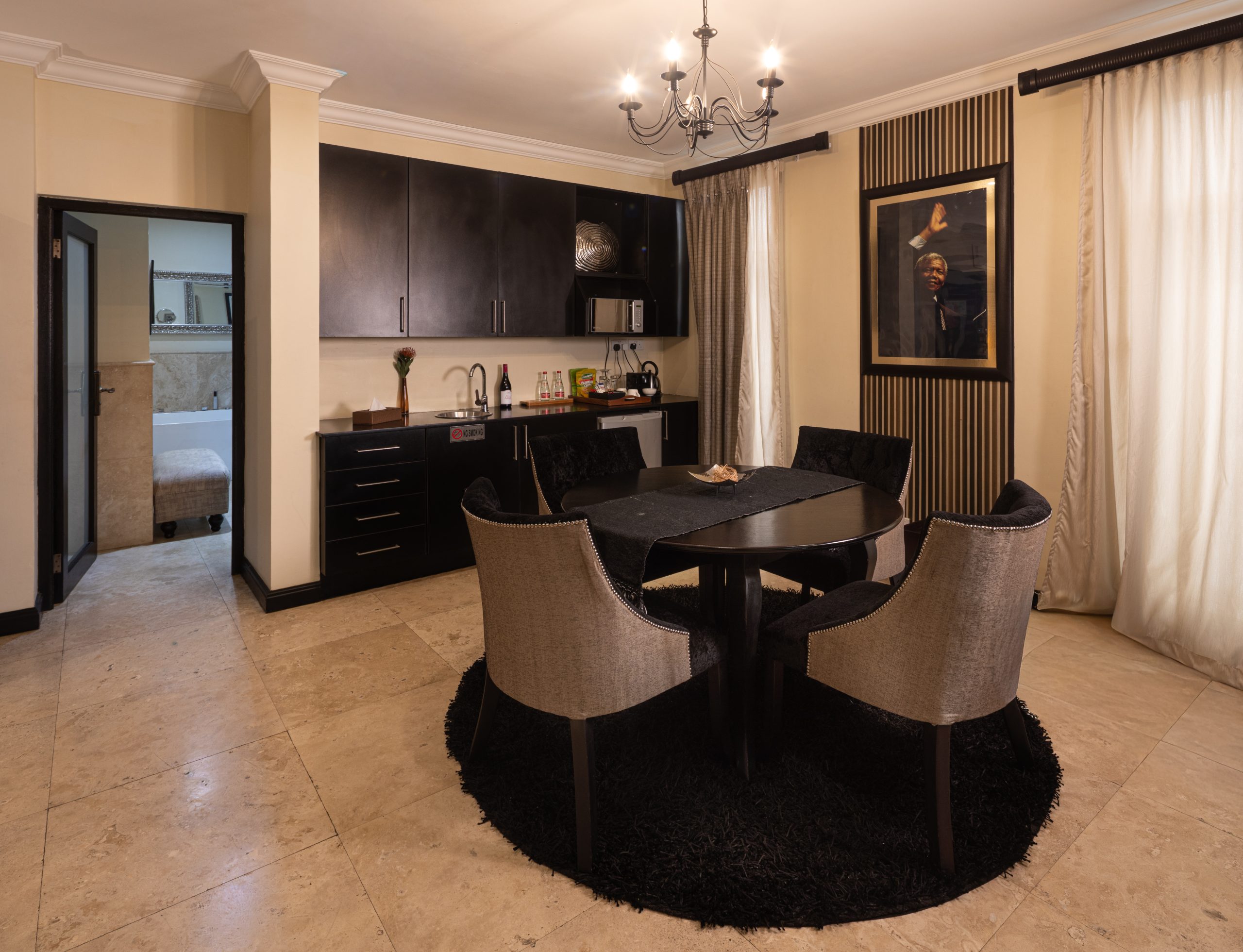 The kitchenette has counter space and real storage—heat something up, keep wine chilled, handle yourself. A round dining table seats four for actual meals or working sessions. The ghost chair at the desk is the tell: transparency in a room that otherwise deals in weight. Mandela knew when to be immovable and when to yield. This suite gets that.