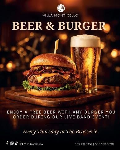 Special Treat: Grab a delicious burger from our menu and enjoy a free beer on the house!